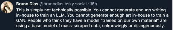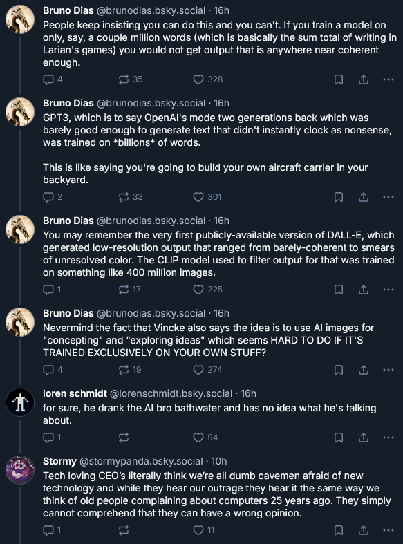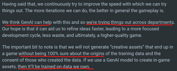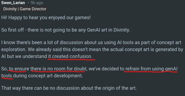 Larian saying that they’ll use LLM on “data they own” is an euphemism saying they intend to continue stealing precisely has they’ve been doing. Nothing changes because as long they can persuade their fans that LLM “start where you see them”, with their prompt, and their actual process is occluded and hidden away from awareness, then… everything can be legally stolen because it can’t be tracked. And they intend to continue to participate in that vicious looting.